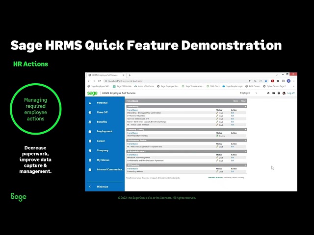 Sage HRMS is an HR management solution that integrates payroll, benefits, recruiting, employee self-service, and analytics capabilities.
